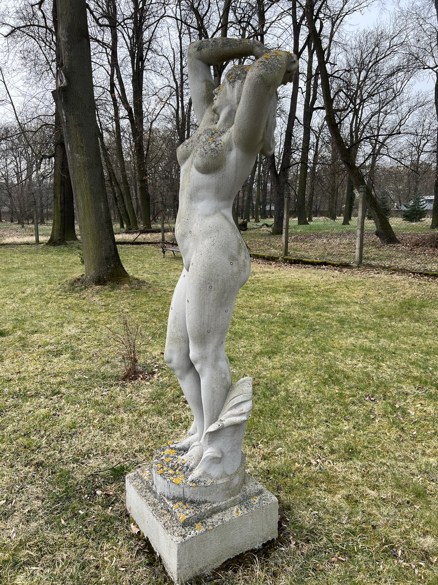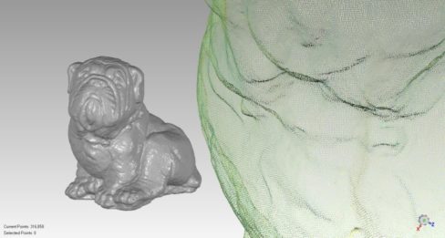 Ukázkový sken sochy umístěné v exteriéru. Skenováno pomocí 3D skeneru Go!SCAN SPARK za použití externí baterie. Skenováno během denního světla. Na sochu bylo aplikováno cca 10 pozičních bodů do míst, kde se skener špatně orientoval na základě geometrie (dlouhé táhlé plochy). Základní rozlišení polygonové sítě je 1,5 mm na hranu trojúhelníků. Chytré rozlišení vypnuto. Skenováno bez textury.