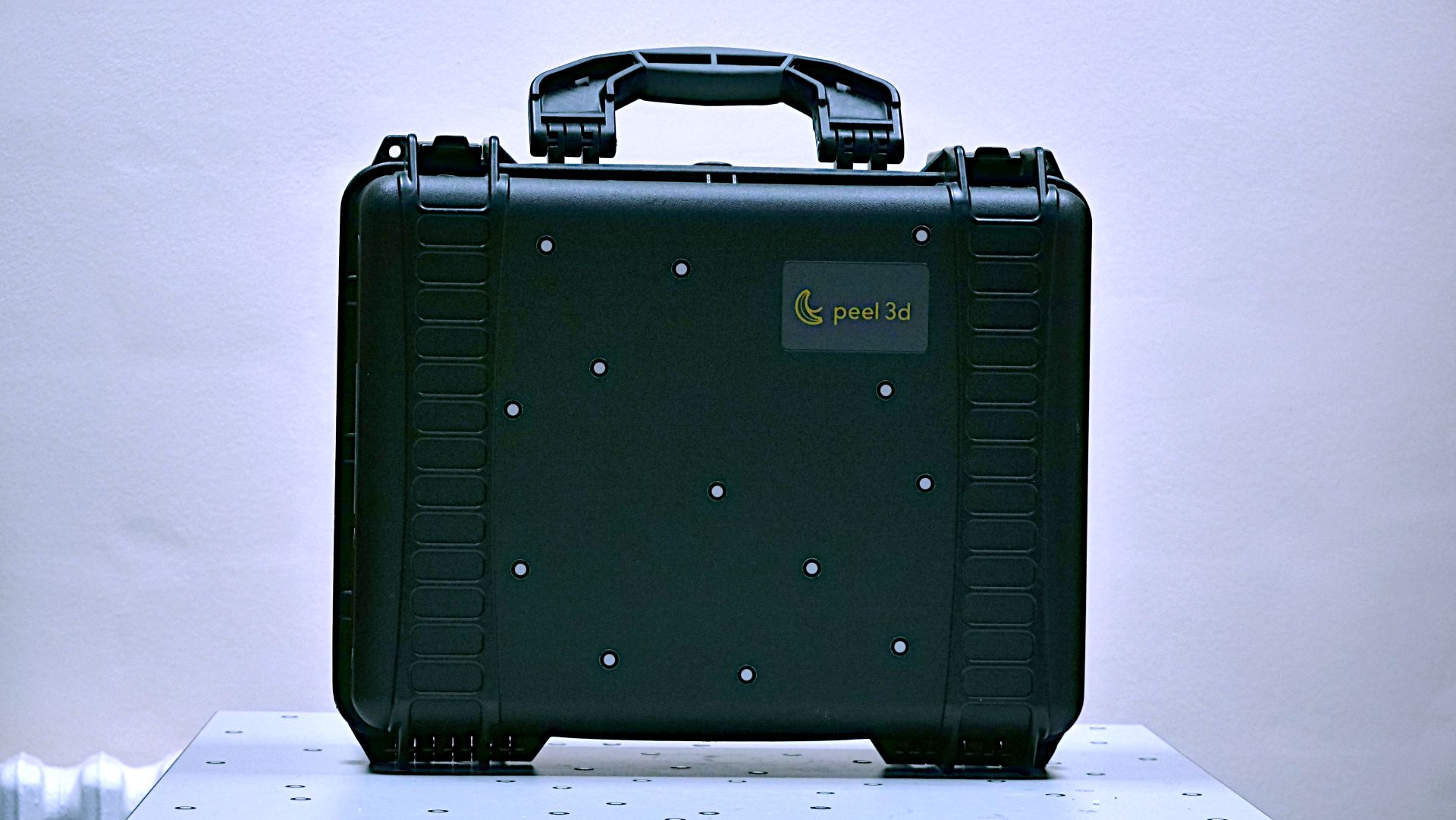 Naskenovaný ochranný kufr pro 3D skener peel o rozměrech cca 440x360x200 mm. Kufr byl skenován bez zmatňování povrchu v originální černé barvě. Základní rozlišení polygonové sítě je 0,8 mm na hranu trojúhelníků. Použita funkce „Smart resolution“ – v místech s vyšší křivostí je rozlišení polygonové sítě automaticky počítáno na polovinu základního rozlišení. Tedy 0,4 mm.