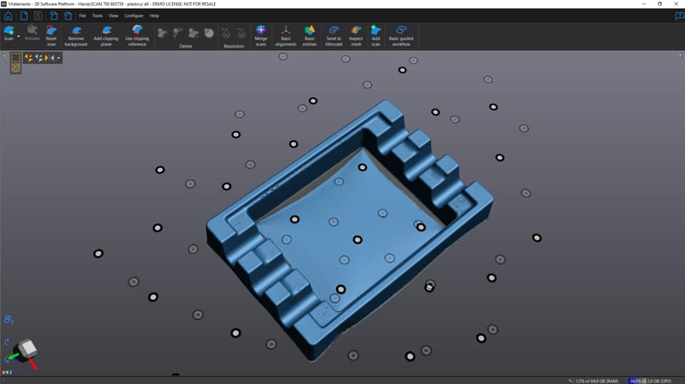 K naskenování jsme použili cenově dostupný ruční 3D skener HandySCAN SILVER se 7 červenými laserovými kříži. Výhodou u tohoto skeneru je možnost přepnout z laserových křížů na 1 laserovou čáru pro hůře dostupná místa.