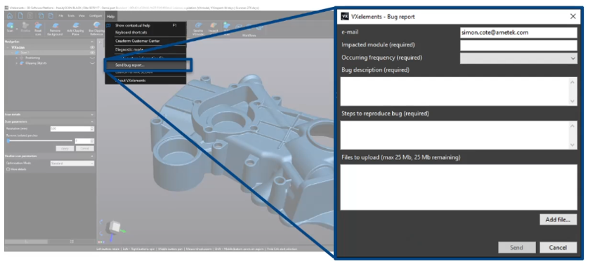Uživatelé nyní mohou sami přímo z programu VXelements odeslat na technickou podporu zprávu o nestandardním chování programu VXelements. Stačí jen popsat problém, přiložit např. obrázek v jakém místě se chyba děje a odeslat. Technická podpora analyzuje problém a bude kontaktovat odesilatele této zprávy.