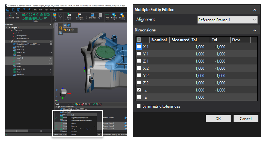 V novém dialogovém okně lze rychle měnit požadavky na vyhodnocení prvků. Můžeme měnit kontrolované rozměry a rychle upravovat tolerance.