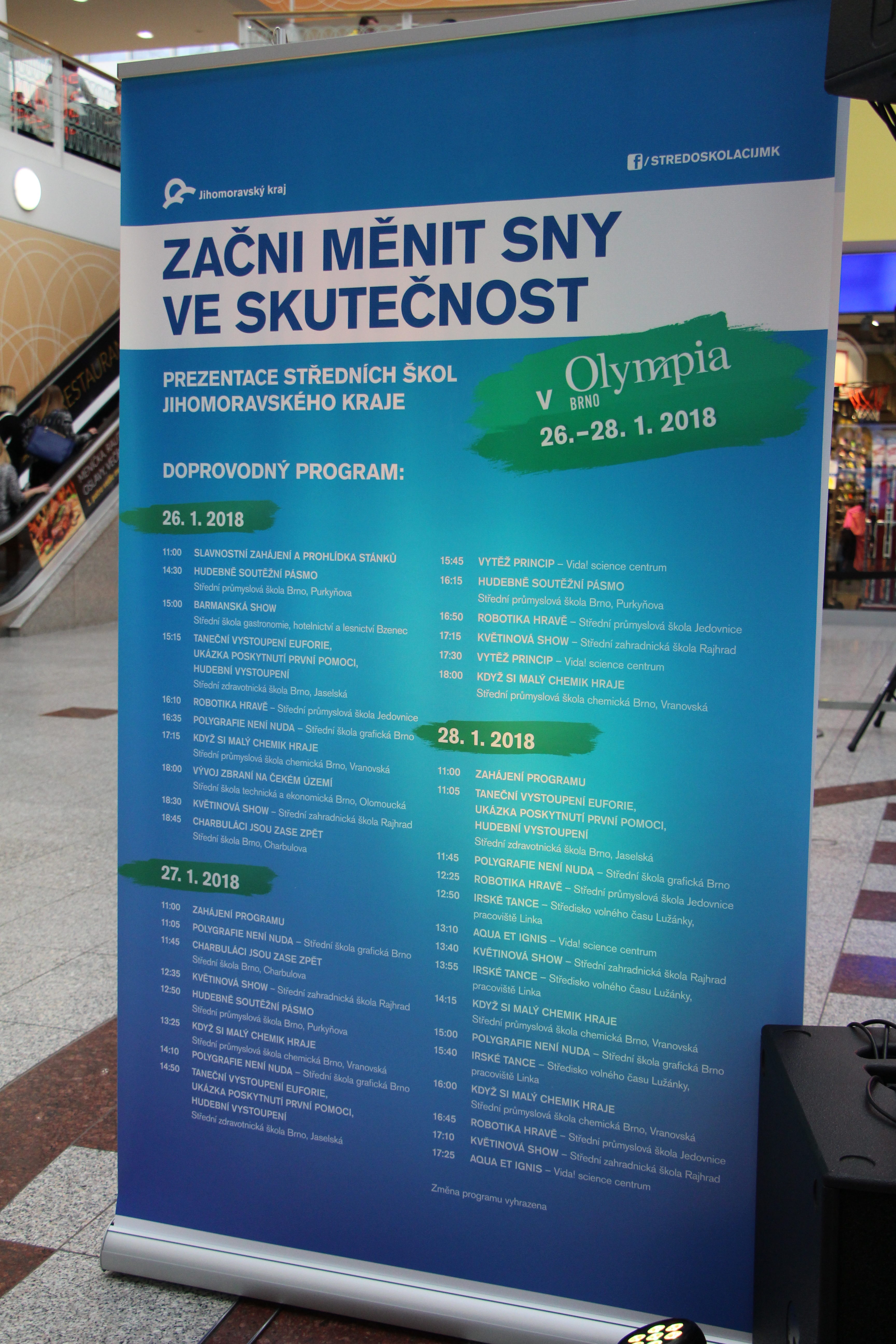 Během víkendu 5.-7.2.2018 se v brněnském obchodním centru Olympia konal již druhý ročník prezentace středních škol. Návštěvníci OC mohli tedy během svého pobytu v centru zhlédnout interaktivní prezentace 33 odborných středních škol z Jihomoravského kraje.
