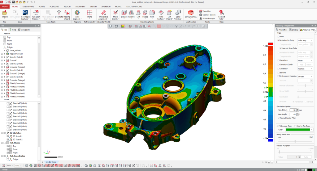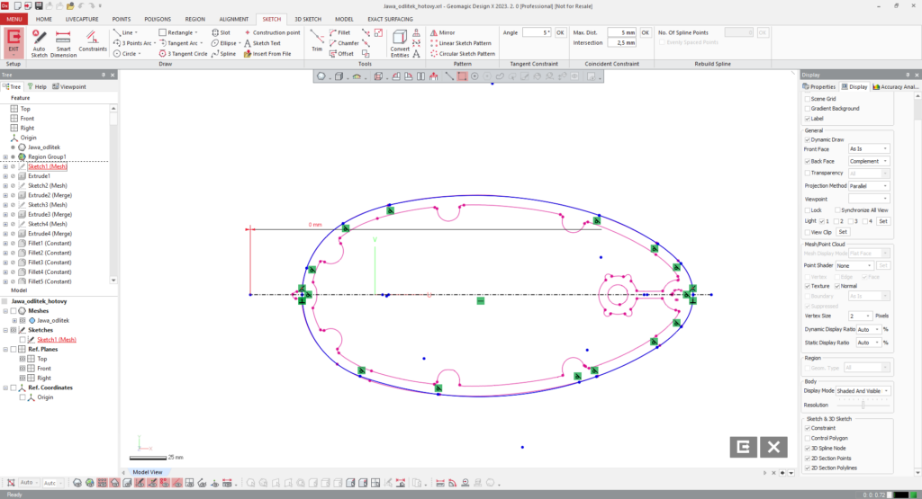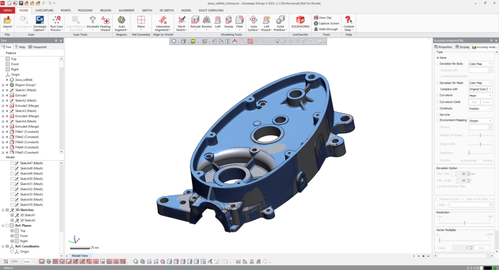 Následně tedy, za použití vhodného programu, díl přemodelujeme do parametrických prvků pomocí skicování a funkcí jako vysouvání, loftování, tažení atd. Vznikne tzv. CAD model, který můžeme dále upravovat a pracovat s ním. Jakmile je model v počítači zbudován, můžeme měnit jeho velikost a jednotlivé rozměry.