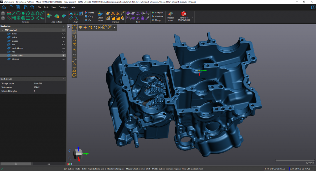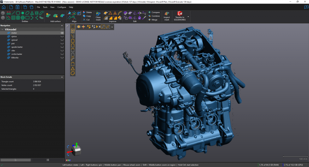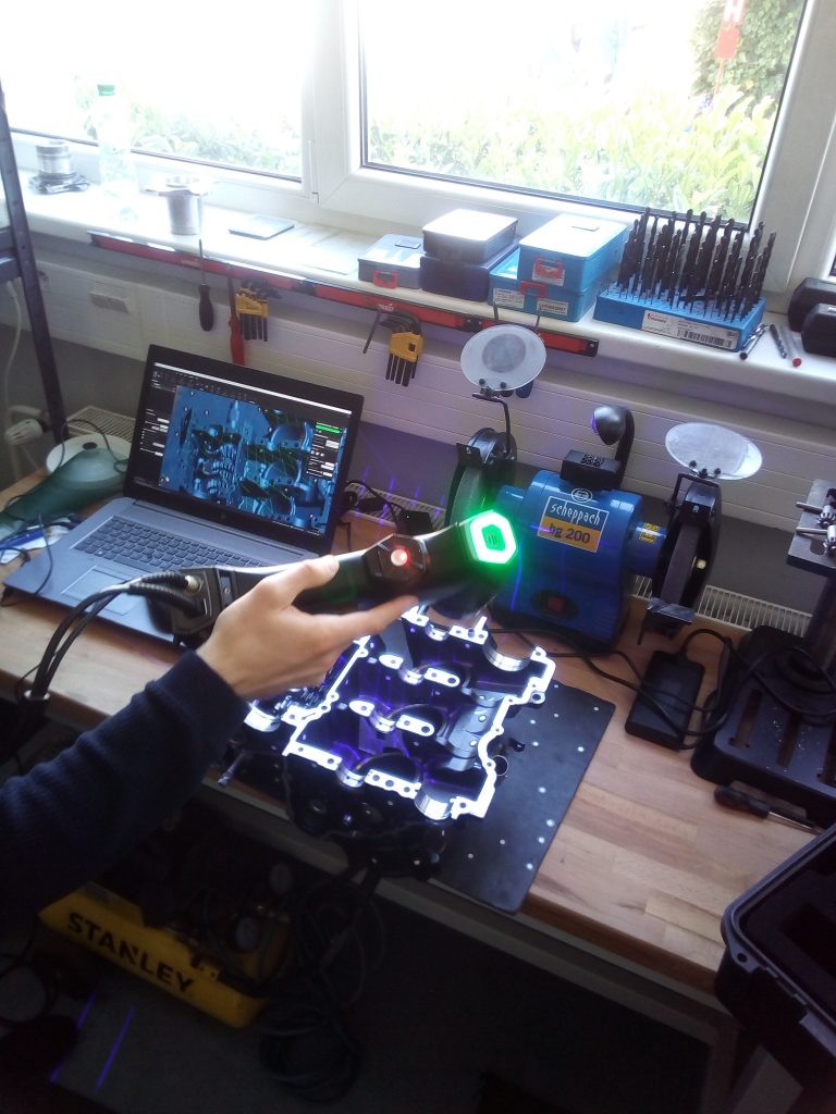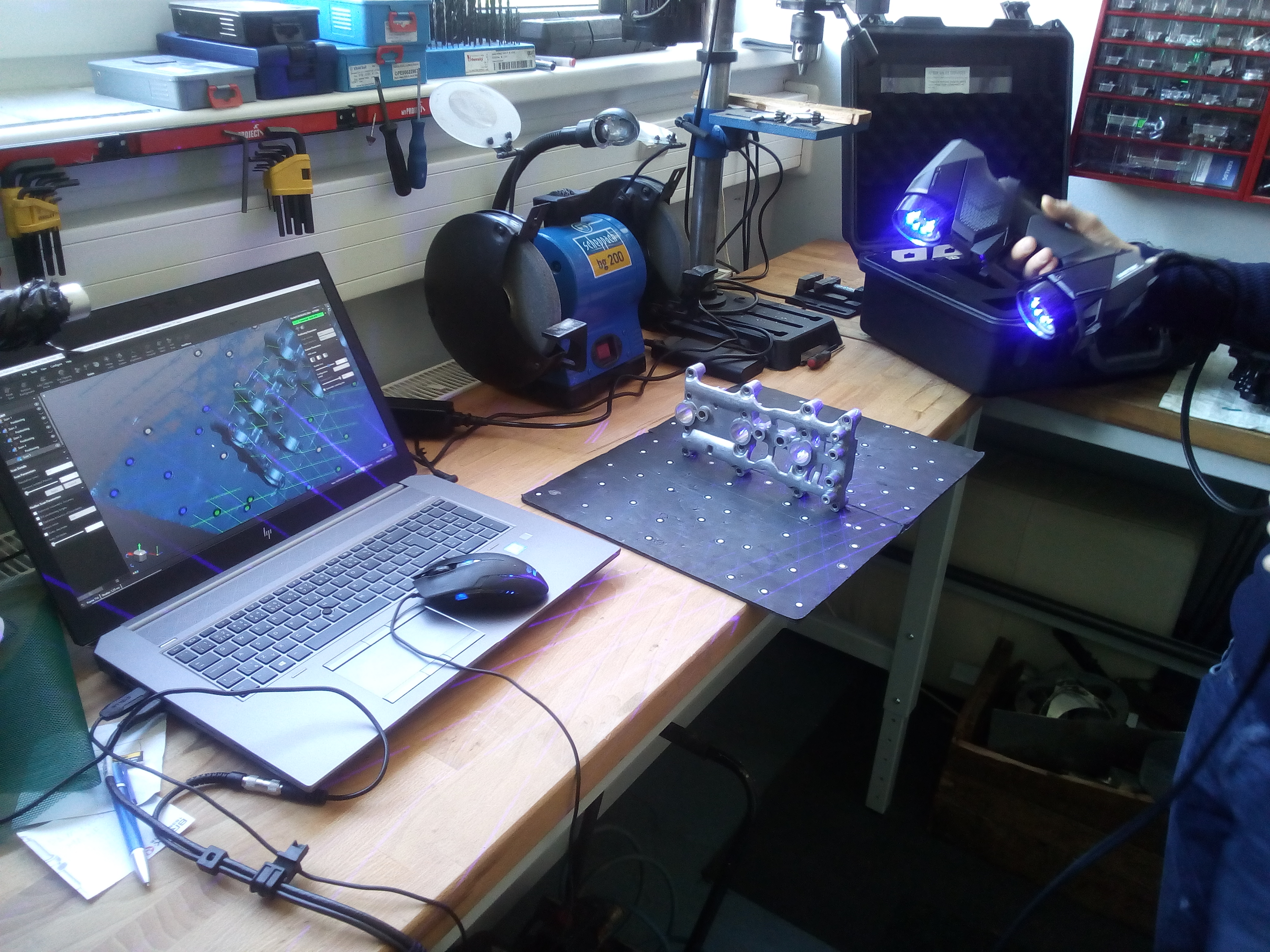 Inovace ale někdy stojí spoustu úsilí i času, a tak je dobré nějaký občas ušetřit. Ideálním nástrojem pro velké zjednodušení práce, časovou úsporu a vyšší přesnost je bezesporu 3D skenování. Pro skenování konkrétně dílů motoru jako např. karter a blok motoru, klikový hřídel atd, bylo použito moderního 3D skenu, který za pár minut zvládl oskenovat tvarově extrémně náročné díly. Problémem nebyly ani složité křivky a záhyby odlitků ze slitiny hliníku, včetně naskenování drobných výrobních nedokonalostí s přesností na 0,02mm. Díky zkušenostem lidí z firmy Solidvision, kteří upravili modely po skenování, je nyní možné tyto součásti použít pro vývoj nového monopostu, respektive jeho srdce – motoru.