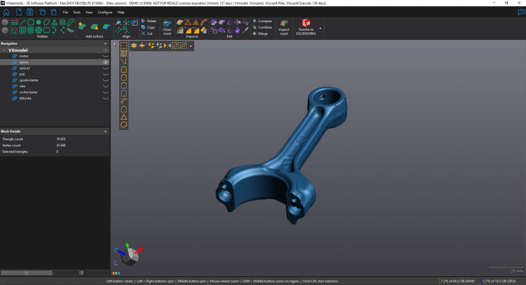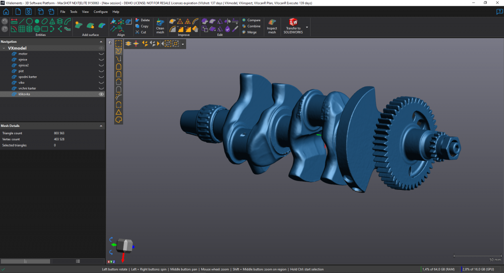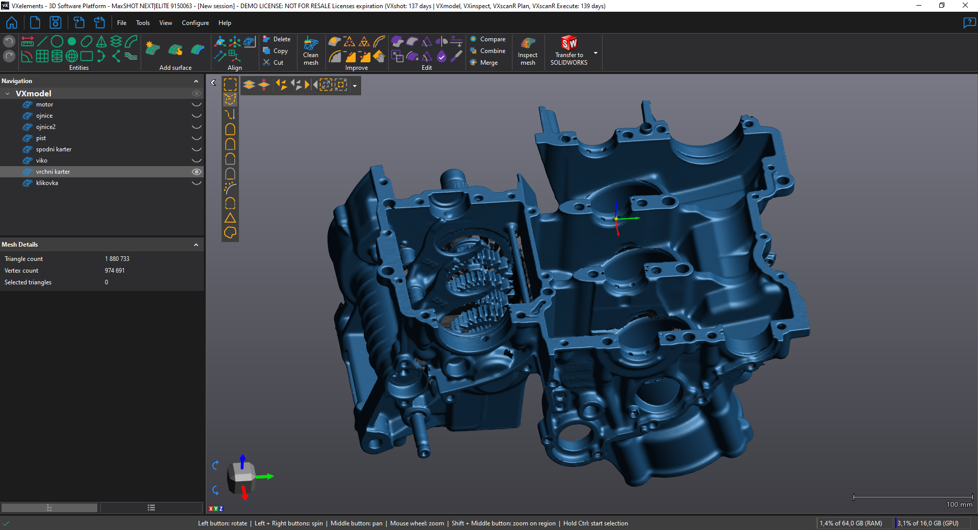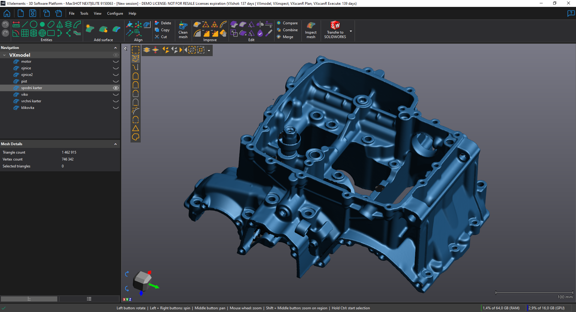 Inovace ale někdy stojí spoustu úsilí i času, a tak je dobré nějaký občas ušetřit. Ideálním nástrojem pro velké zjednodušení práce, časovou úsporu a vyšší přesnost je bezesporu 3D skenování. Pro skenování konkrétně dílů motoru jako např. karter a blok motoru, klikový hřídel atd, bylo použito moderního 3D skenu, který za pár minut zvládl oskenovat tvarově extrémně náročné díly. Problémem nebyly ani složité křivky a záhyby odlitků ze slitiny hliníku, včetně naskenování drobných výrobních nedokonalostí s přesností na 0,02mm. Díky zkušenostem lidí z firmy Solidvision, kteří upravili modely po skenování, je nyní možné tyto součásti použít pro vývoj nového monopostu, respektive jeho srdce – motoru.