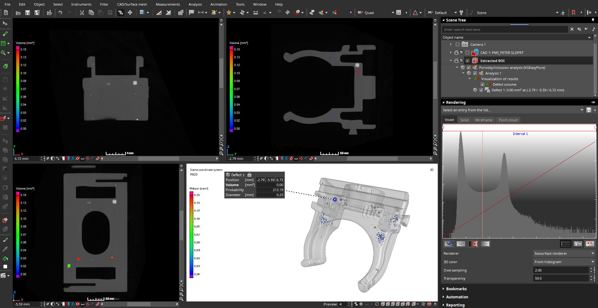 Špičkové softvérové riešenie pre precízne spracovanie a analýzu dát priemyselnej výpočtovej tomografie. Voxelová reprezentácia materiálu umožňuje detekciu, analýzu, vizualizáciu a štatistické vyhodnotenie vnútorných materiálových štruktúr na základe zvolených parametrov. Komplexný nástroj pre metrológiu a NDT s možnosťou automatizácie, vizualizácie/segmentácie a tvorby animácií.