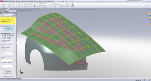 SolidWorks si sám vytvoří návrh ploch na objektu a uživatel má možnost volby „Detailů plochy“. CAD přichytí na objekt jednotlivé plochy a v případě nesprávného uchycení uživatel upraví špatně uchycené plochy manuálně. Plochy nejsou parametrické.